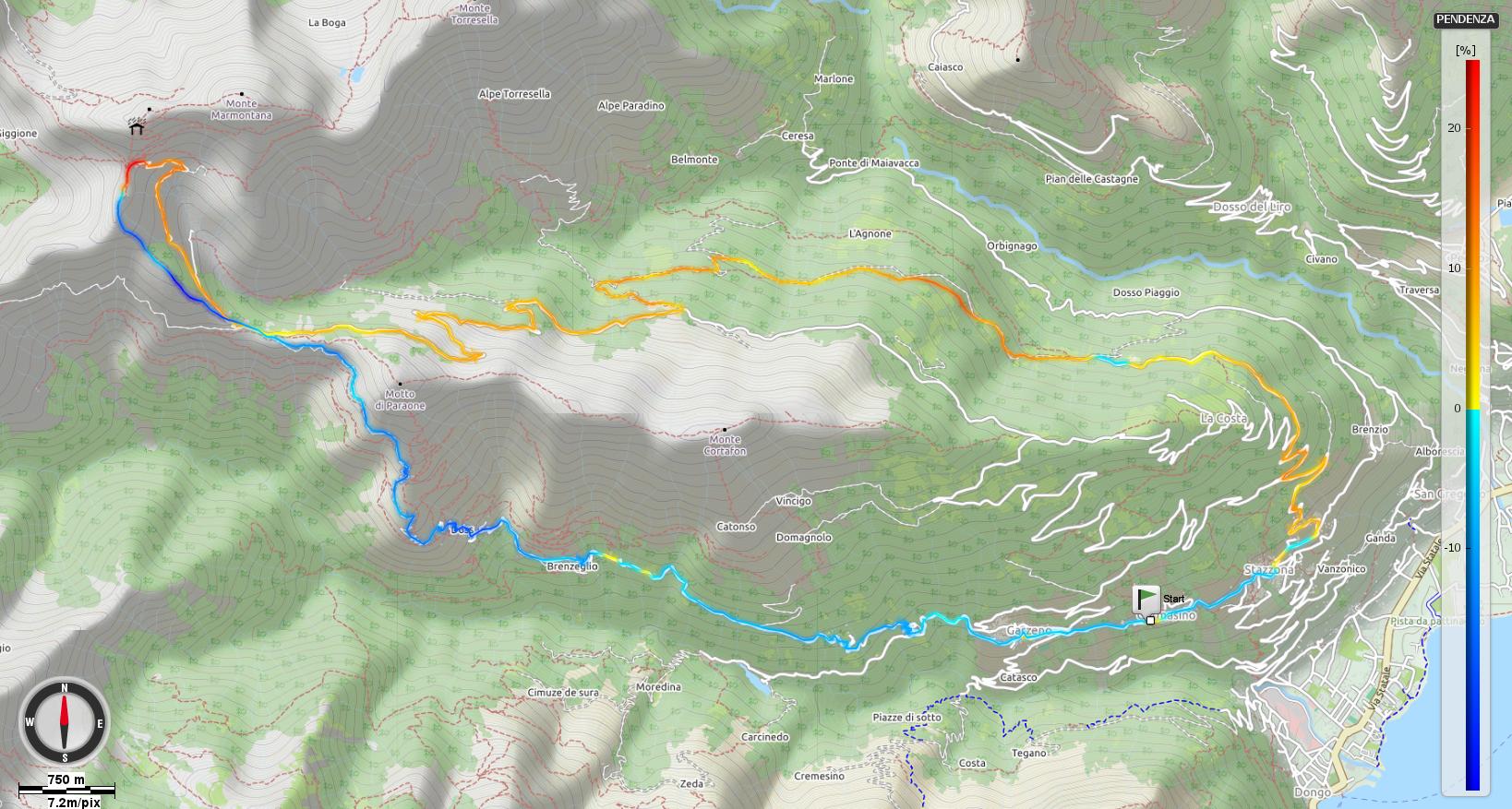 salita: fino al Rifugio Giovo è semplice dato che nella prima parte, fino a qualche km prima del Rifugio Mottafoiada, si svolge su asfalto (ancorchè non in buone condizioni) molto ombreggiato e con pendenze non superiori al 10% (da segnalare una breve rampa dove si toccano punte al 17-18%), ed in seguito si percorre uno sterrato dalle pendenze ridotte (7-8%) e mediamente in ottimo stato (la parte più accidentata di fatto la si trova nell’ultimo km prima del Mottafoiada); inoltre spesso i tratti più ripidi sono cementati. Diventa decisamente più impegnativa invece la parte successiva che segue il Rifugio Giovo salendo al Rifugio San Jorio: il fondo peggiora sensibilmente nella prima parte (fondo sassoso/pietroso molto mosso) diventando cementato/lastricato nella seconda (purtroppo però le pietre cementate non agevolano la salita), ma in generale le pendenze sono molto più rilevanti, tendenzialmente attorno al 12-14%. Parecchio impegnativo infine per le pendenze il sentiero finale che porta alla Chiesetta di San Jorio (punte fino al 23% per pochi metri)