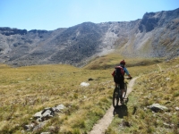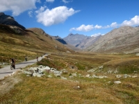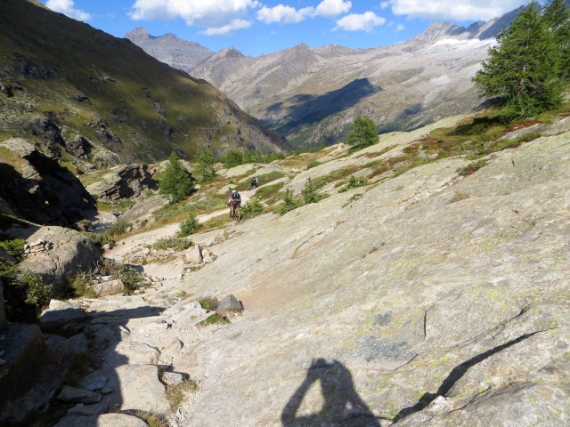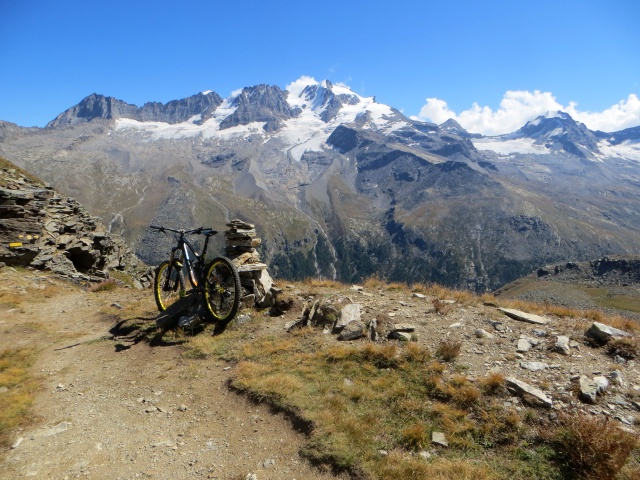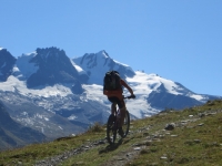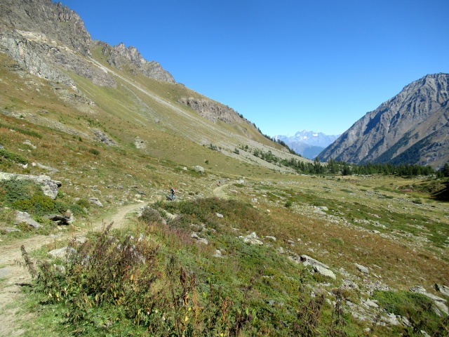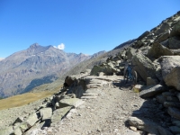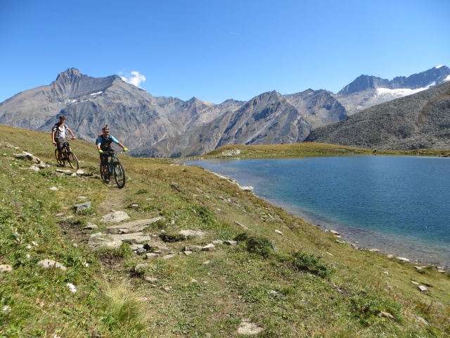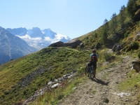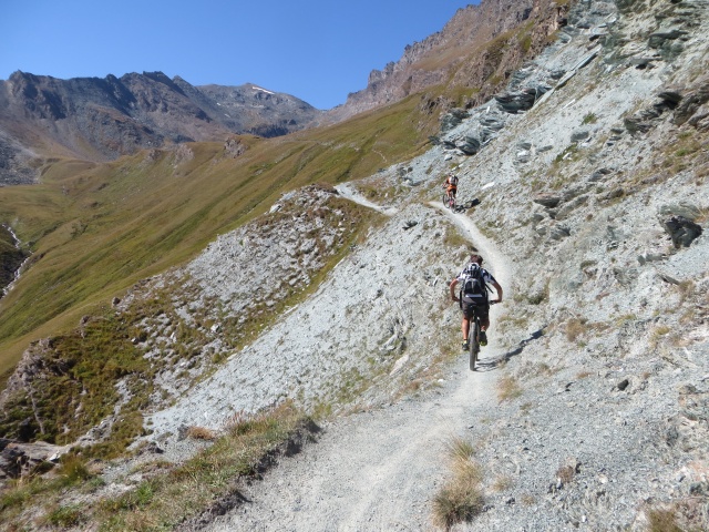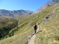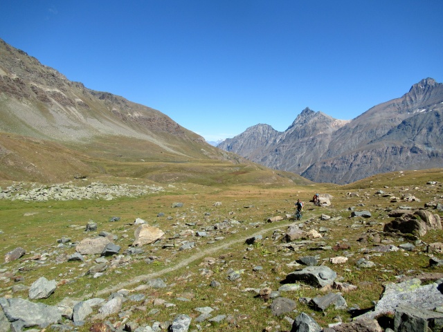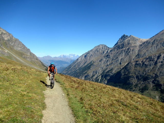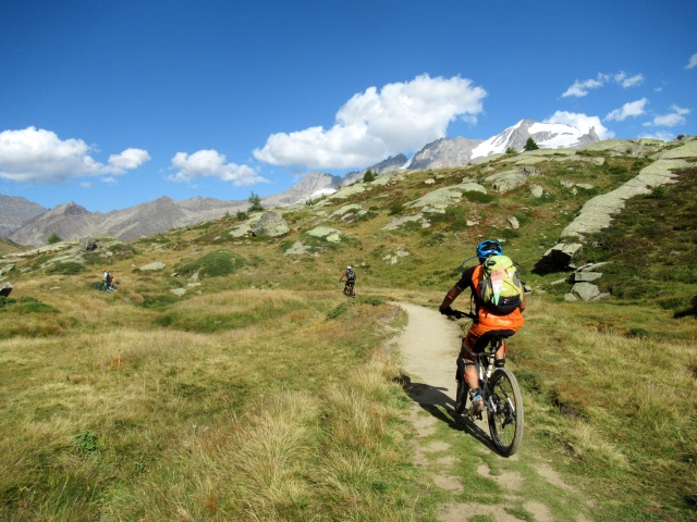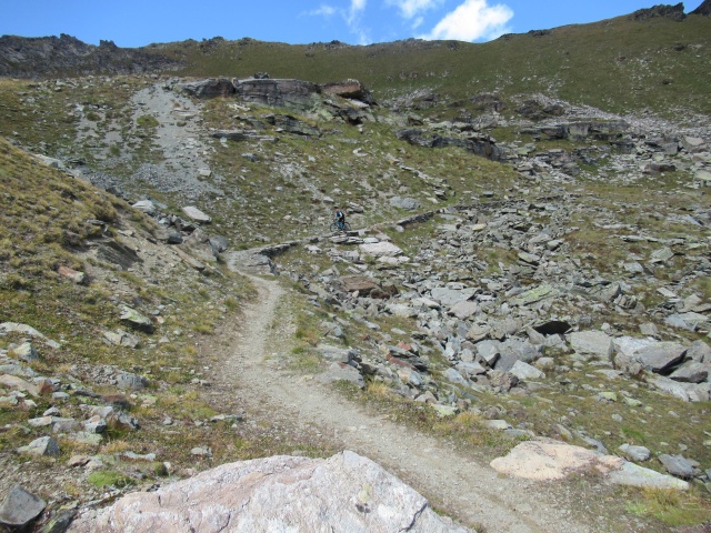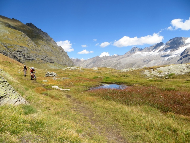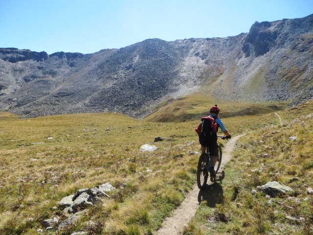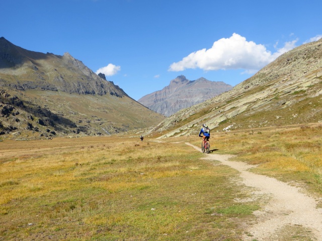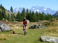 Pedalando lungo il sentiero che collega il Lago Djouan superiore al Colle Manteau (di fronte)