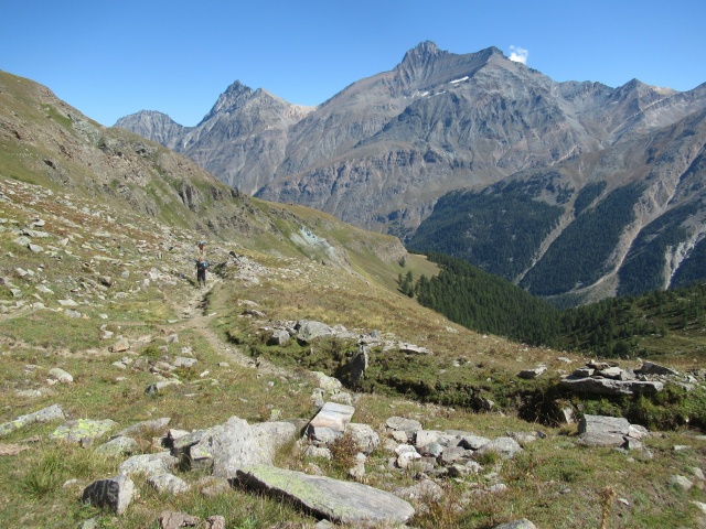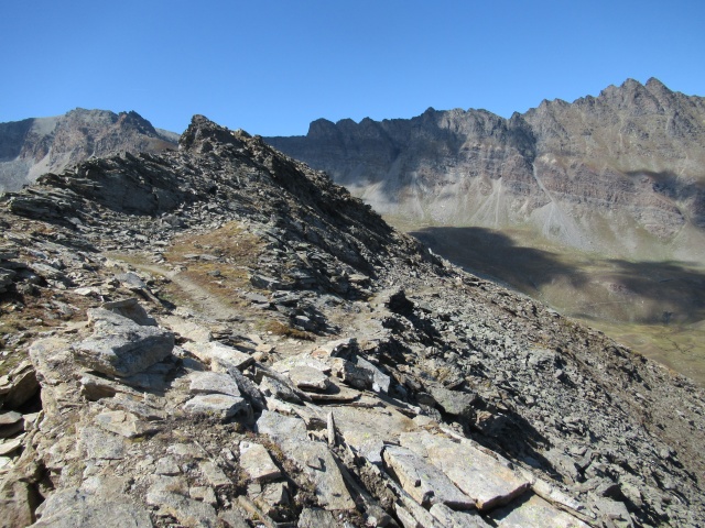 Vista dal Colle Manteau - Il sentiero (da percorrere in seguito) che risale un costone roccioso