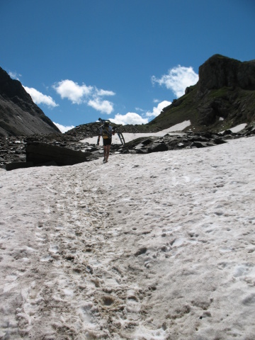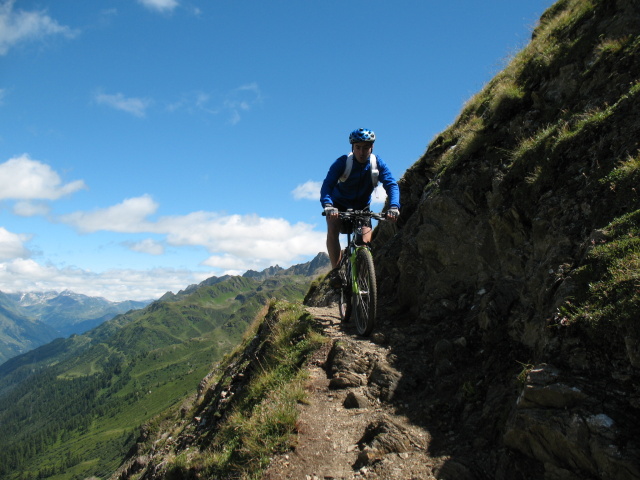 Giornata ideale, non tanto caldo per un giro completo di buona tecnica, allenamento e bellezza. Dal passo San Giacomo una discesa diretta porta al lungo traverso che anche se esposto tecnicamente non è problematico, bisognare fare attenzione ai singoli passaggi che discriminano il bravo dal normale pedalatore. Gli ultimi pendii per arrivare alla capanna li ricordavo nella normalità ma non avevo la mtb, spingerla su quegli strappi non è proprio l ideale, ho ovviato per i pratoni laterali sempre in pendenza ma costante, dal rifugio al passo si alternano singoli strappi e neve (bisogna averne per stare sempre in sella) i nevai con neve compatta e tracciata (erano le ore 12.00) alternandosi a sentiero e pietraia arrivano fino alla fine del lago del Gries, si supera il passo in sella per poi iniziare a scendere, la buona tecnica abbinata ad un senso del vuoto fà la differenza per scendere guidando arrivando così al pianoro del bettelmatt ed alla successiva gippabile che in poco tempo porta alla casa dei guardiani e a Riale luogo di partenza. percorsa il 22/07