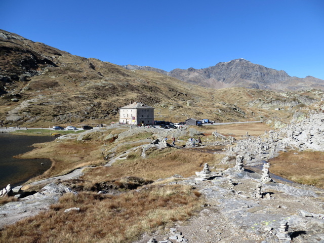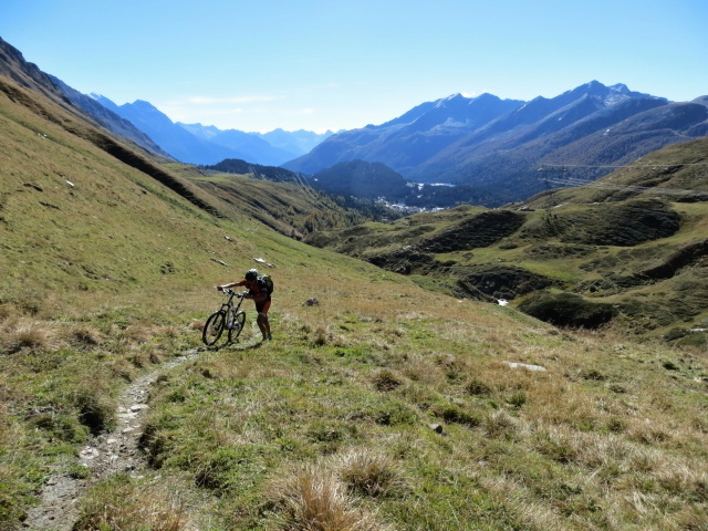 tratto a mano: 35 minuti complessivi aggregando più tratti. Nel dettaglio dopo Pian Lumbrif, causa traccia dapprima ripida e scavata ed in seguito rocciosa, si percorrono 2 tratti a mano per complessivi 25 minuti (10 + 15 minuti) sino a giungere alla quota massima di elevazione nello spoglio territorio di Alp Montagna dove parte il sentiero in discesa direzione Hinterrhein; infine conteggiare 10 minuti circa per risalire su sentiero roccioso dal Passo all’inizio della discesa su sentiero per San Bernardino