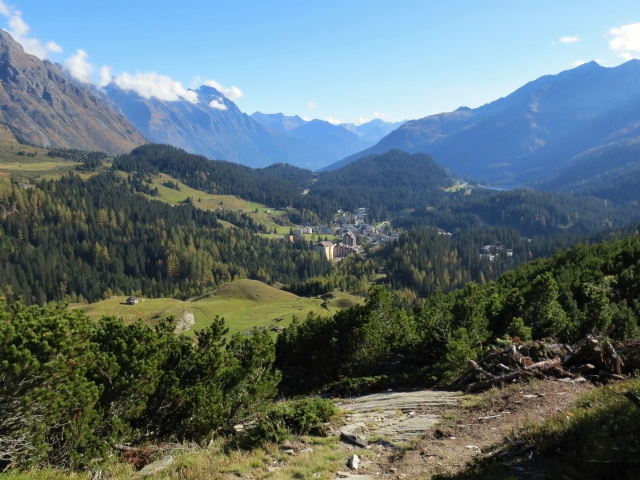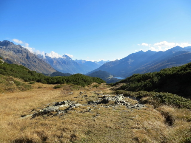 Lungo il sentiero di ritorno dal Passo del San Bernardino, sullo sfondo il Lago d'Isola ed il paese di San Bernardino