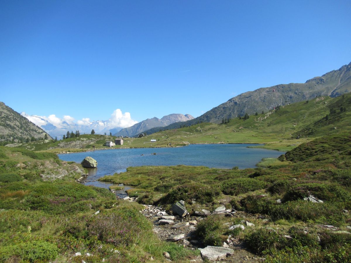 In questa parte centrale dell’itinerario ci si innesta su un percorso circolare che collega i vari insediamenti alpini/villaggi in cui si divideva, sin dalla antichità, il grande alpeggio del Sempione e che permette di ammirare il tipico paesaggio della Bergalpe del Passo del Sempione fatto di dossi, paludi, pascoli alpini e proprietà private murate con lunghe file di pietre tra i pascoli. La traccia innanzitutto aggira il Rotelschsee ed evitando di scendere all’Ospizio del Sempione, transita presso le belle abitazioni della sovrastante alpe attraverso un percorso in fuoristrada ben contrassegnato dalle indicazioni sentieristiche; si scende poi verso l’asfalto della A9 in prossimità del Passo, lo si attraversa e si prosegue su sentiero dapprima in discesa (evitare la deviazione per Briga attraverso lo Stockalperweg) ed in seguito in leggera salita per arrivare ad un successivo piccolo aggregato di abitazioni. Un tratto in salita, di cui una cinquantina di metri piuttosto ripidi su mulattiera, portano a superare un dosso oltre il quale si trova il secondo bel lago alpino di giornata: si tratta del Hopschusee. Qui si percorre il facile sentiero che lo fiancheggia sino ad arrivare rapidamente alla testa del laghetto, poi seguendo una flebile traccia nei prati (si potrebbe proseguire sul sentiero principale ma si sale con tratti poco ciclabili) ci si muove in direzione delle baite del villaggio di Hopsche (brevissima risalita a mano nei prati) dove si incontra uno sterrato. Stando sulla strada ed evitando una prima deviazione a destra (traccia su sentiero troppo scassata in discesa) si segue il percorso in discesa e quasi al termine dello sterrato lo si abbandona sulla destra (deviazione poco evidente) per ricollegarsi alla traccia di sentiero evitata in precedenza. Ora si rimane senza possibilità di errore sul bel single-track che prima attraversa una caratteristica zona rocciosa utilizzata spesso come palestra di roccia ed in seguito scende in maniera molto scorrevole verso il villaggio di Blattu. Da qui, seguendo la deviazione per il Bistinepass (da abbandonare poco dopo), su traccia di sentiero che attraversa i prati ci si porta verso il villaggio di Bielti dove un tratto di asfalto in leggera discesa conduce alla piana del vecchio Ospizio del Sempione dove una brevissima risalita di quota permette di intercettare lo Stockalperweg.