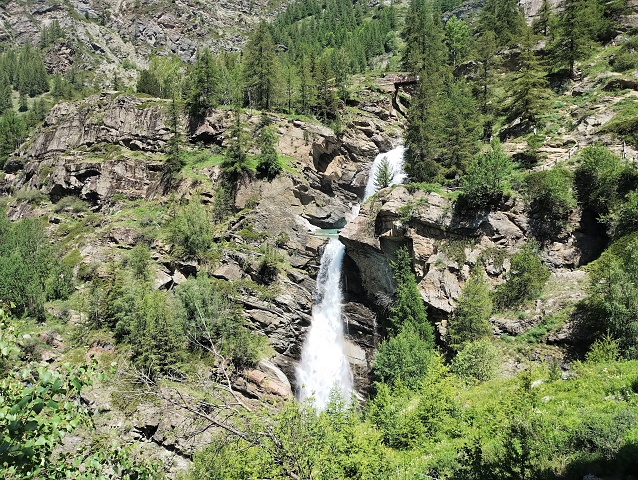 Giunti alle porte di Cogne, in località Son le Prà, si continua a destra all’interno del bosco attraversando la pista di sci alpino tramite un ponte di legno per muoversi con qualche ripido strappo verso i magnifici prati di Sylvenoire dove, dapprima una sterrata, poi un bel sentiero e successivamente un altro tratto sterrato conducono alle porte di Lillaz. L’itinerario, superato un ripido strappo al limite della pedalabilità, raggiunge il ponte sul torrente Valeille: vale la pena non attraversarlo e proseguire oltre all’interno della Valeille superando un caratteristico masso erratico sino al termine della larga traccia ciclabile con bella vista delle vette del Gran Paradiso; ritornati poi al ponte lo si attraversa perdendo leggermente quota sino a giungere all’attacco del sentiero per le famose cascate di Lillaz (già visibili da qui ma in un paio di minuti si può raggiungere a piedi un bel balcone panoramico ai piedi dell’ultima cascata).