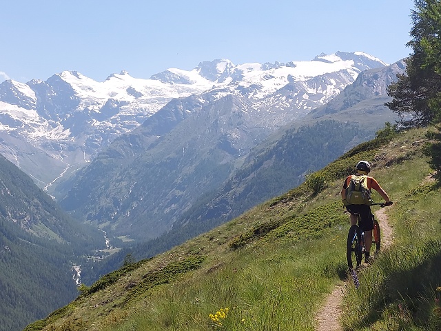 salita: ad eccezione di alcuni ripidi brevi strappi le salite in Valnontey, in Valeille ed alle cascate di Lillaz si svolge su facili tracce di forestale o larghi sentieri con pendenze che risultano sempre ben pedalabili; diverso discorso vale per la risalita nel vallone di Grauson, dove il sentiero nella parte iniziale sopra Gimillan impone passaggi inizialmente difficoltosi e nella parte finale (dopo l’attraversamento del torrente) molto ripidi (16-18%); infine da segnalare alcuni “fastidiosi” (in quanto collocati alla fine dell’itinerario) rilanci sulla forestale di ritorno da Epinel verso Cogne