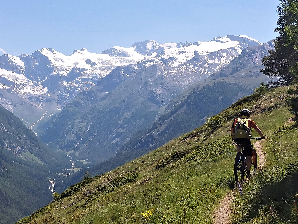 Al termine della doverosa sosta si ritorna su sentiero verso Lillaz e ci si dirige verso Cogne attraverso la pista da fondo che si sviluppa nei boschi costeggiando il torrente d’Urtier sino alle porte dell’abitato dove in località Moline (quota 1.550) si attraversa nuovamente il torrente e ci si muove verso il museo minerario di Cogne per iniziare la parte più impegnativa dell’itinerario: dapprima 3 facili km su asfalto conducono a Gimillan poi si prende il bivio per il Rifugio Grauson (sentiero 8) si comincia a salire con maggior decisione prima su sterrato e poi su sentiero all’interno del vallone di Grauson con qualche breve tratto accidentato ed in parte moderatamente esposto fino a perdere leggermente quota per attraversare il torrente Grauson nei pressi delle baite di Encloseur (quota 1900); il sentiero riprende a salire con pendenze elevate (16-18%, ciclabile con ottima preparazione) all’interno dei circostanti prati sino a quota 1.980 dove si interrompe la salita e si prende l’opposto sentiero che scende alle baite di Tchezeu (1.950) superate le quali al termine di un tratto di falsopiano il sentiero sale con maggior decisione sino ad una breve ripida traccia prativa (pendenze oltre il 20%) che scollina al Pian della Cretetta. Dal Piano si va ad intercettare con libera traccia prativa il vicino sentiero balcone che corre inizialmente in piano per qualche centinaio di metri poi, al successivo bivio, sale con maggior decisione raggiungendo il punto massimo dell’itinerario (quota 2.140). Da qui con alternanza di tratti in salita e tratti di bella discesa si arriva in circa 7 km al Villaggio di Epinel dove attraversato il torrente Gran Eyvia si ritorna a Cogne seguendo una pista forestale in saliscendi che si sviluppa sulla sua sinistra orografica