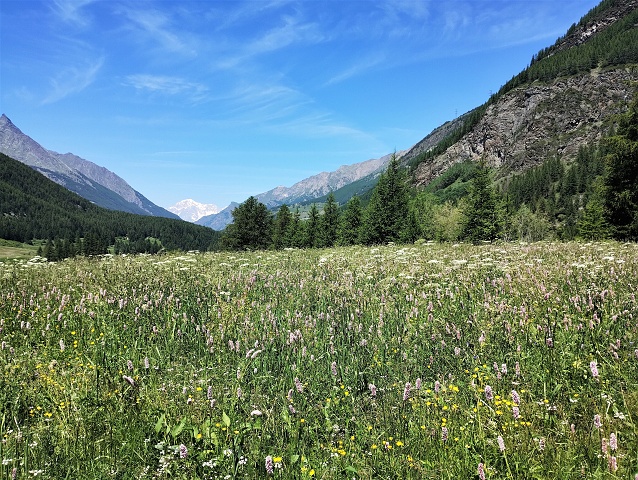 Nei prati sopra Lillaz - Sullo sfondo il Monte Bianco