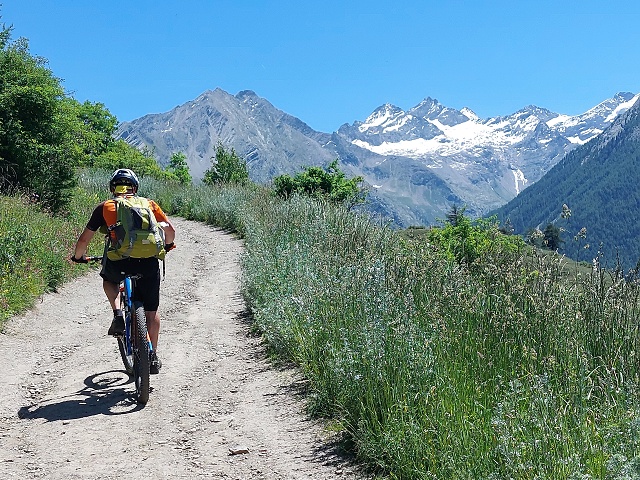 Lo sterrato che da Gimillan sale in direzione di Grauson - Sullo sfondo il ghiacciaio della Valeille, il ghiacciaio delle Sengie ed il ghiacciaio Ciardoney