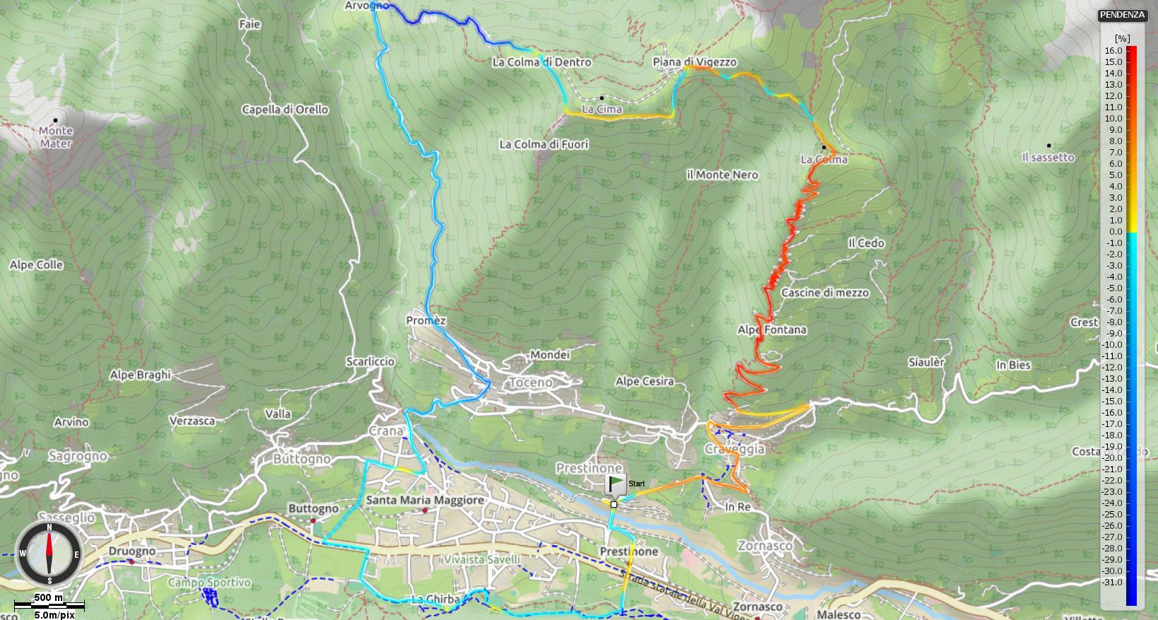 Il giro sfrutta alcuni sentieri e forestali che si sviluppano sopra l’abitato di Santa Maria Maggiore in Valle Vigezzo offrendo buoni panorami sull’arco alpino e la sottostante vallata. Per comodità logistica la partenza può essere fissata da libera area di sosta, in Prestinone, sita immediatamente a sinistra superato il ponte sul torrente Melezzo. Da qui ci si dirige in direzione di Craveggia su strada asfaltata ed a seguire le indicazioni per Vasca. Usciti dall’abitato di Craveggia la traccia gps devia a sinistra in leggera salita per la “Strada dei Vecchi” che, superato l’iniziale tratto su asfalto, ben presto diviene a fondo sterrato e sale all’interno del bosco per gli alpeggi della Colma di Craveggia. La salita risulta priva di particolari difficoltà alternando tratti tranquilli a tratti più impegnativi per le pendenze affrontate anche se il fondo permane in buono stato fino nei pressi di uno spiazzo a quota 1.620mt ca. Da segnalare che durante la seconda parte della salita si aprono interessanti panorami sulla catena del Monte Rosa e sulle vette del cosiddetto “Trittico del Sempione”, Weissmies in primis. Giunti al sopracitato spiazzo inizia una traccia di sentiero, subito impegnativa dalla partenza. Attenzione però al fatto che percorse poche decine di metri si incontra un bivio ove è altamente consigliato deviare a destra verso la traccia più semplice: entrambi i tratturi infatti conducono alla Colma ma quello che si snoda più diretto risulta assai ripido e difficilmente pedalabile mentre il secondo aggira la sommità dove è posta la croce con un traverso di fatto interamente ciclabile e molto panoramico sulla vallata. Superata nei pressi di una panoramica panchina la deviazione per l’Oratorio di San Rocco il sentiero procede sempre ben ciclabile fino agli alpeggi della Colma ove si incontrano le indicazioni segnaletiche per La Piana di Vigezzo: segue ora un tratto in leggero saliscendi nel bosco non sempre ciclabile causa ostacoli naturali e radici anche se i tratti con bici a mano si contano “sulla punta delle dita” ed in ogni caso per pochi minuti. Il sentiero sbuca nei pressi dell’ovovia della Piana e tenendo la sinistra si segue la traccia carrabile che si inoltra verso le baite: il tratto che ora si affronta risulta estremamente semplice in sostanziale piano e Arrivo all’Alpe Colma di Dentro, panorama, quota 1.705 dove inizia un tratto decisamente complicato. Si deve affrontare infatti una discesa lungo le piste invernali, inizialmente effimera in quanto non desta particolari difficoltà anche se ben presto impone di affrontare un ripido molto pietroso (difatto un accumulo di pietre e ghiaia…..) che è assolutamente impossibile da affrontare se non con bici a fianco procedendo a zig-zag per tagliare la pendenza lungo l’esile traccia di risalita a piedi. In meno di 10 minuti si supera il tratto difficoltoso di pietre e tenendo la sinistra si “inventa” una traccia nei prati in direzione del bosco all’inizio del quale si incontra una (inizialmente non evidente) traccia di sentiero che scende a valle: essenziale dunque in questo tratto seguire fedelmente la tracciatura gps per evitare si girare a vuoto alla ricerca del sentiero. La discesa da affrontare presenta diversi tratti molto tecnici e con tornanti a volte molto stretti per cui le doti personali di discesa saranno qui testate a dovere. Superati alcuni passaggi complicati, anche ricorrente a breve conduzione a mano, si giunge in prossimità delle abitazioni di Arvogno. Ancora una volta occorre seguire fedelmente la traccia gps in quanto superata la condotta artificiale frangi-acque si trova una non evidente traccia di sentiero che attraversa i sottostanti campi tra le abitazioni e conduce alla presa dell’asfalto. Ora non resta che percorrere l’asfalto in discesa verso Toceno e, seguendo sempre la traccia gps, portarsi ai margini di Santa Maria Maggiore sulla ciclabile della Val Vigezzo che verrà seguita in direzione dell’originaria partenza