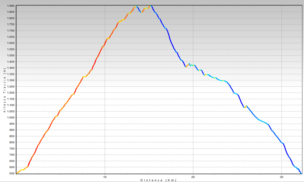 salita: dal punto di vista tecnico è prevalentemente su asfalto su tranquilla strada all’interno del bosco per cui non vi sono particolari difficoltà da segnalare; si sviluppa però con pendenze per molti tratti superiori al 10-12% fino al 16-17%(addirittura da segnalare un paio di punti in cui si sfiora il 20% attorno a quota 1.500) per cui non può certamente considerarsi una salita tra le più agevoli; l’arrivo al Rifugio Crosta è preceduto da un breve tratto sterrato piuttosto ripido (prima parte rampa su fondo scassato al 23%, poi diversi punti al 14-15%), dopodichè segue un successivo tratto per l’Alpe Marsasca al 12% max; da lì in poi il proseguo è meno impegnativo