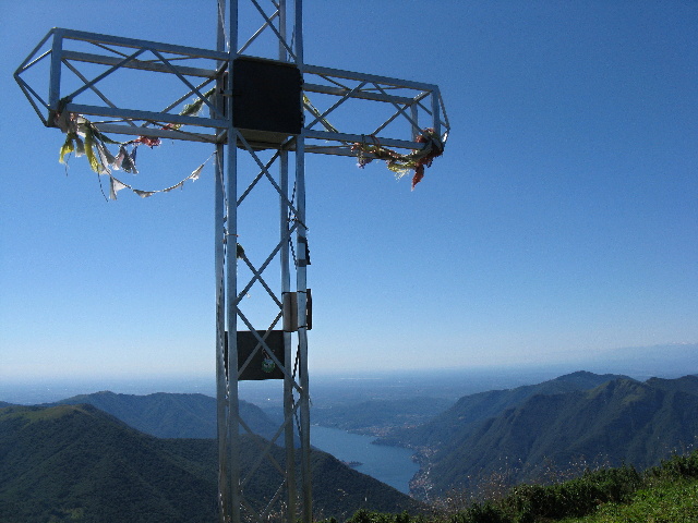 La croce posta sulla vetta del San Primo - Panorama sul basso Lago
