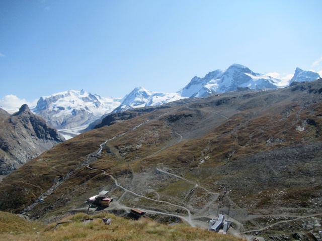 Trockener Steg - Panorama su Cima di Jazzi ( nelle nuvole, 3.803), Fillarhorn (dx, 3.676) e Gornergletscher