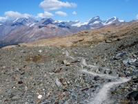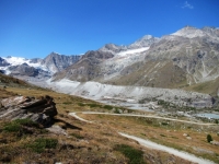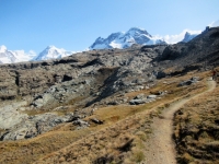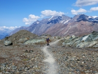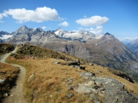 Discesa su sentiero alpino da Trockener Steg - Panorama su massiccio del Monte rosa con il Gornergletscher ed il Grenzgletscher