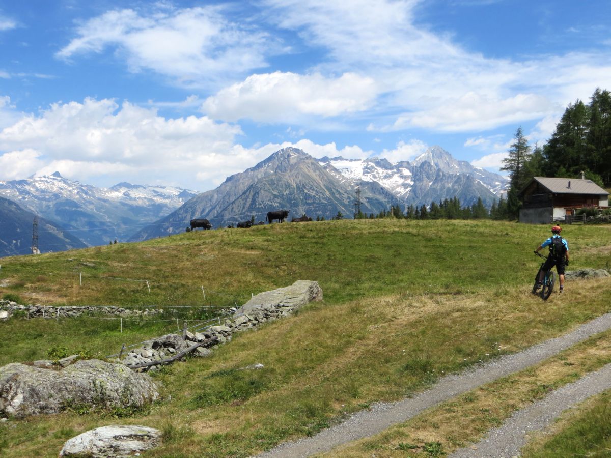 Il giro inizia da fondovalle dal parcheggio della stazione ferroviaria di Raron e precisamente in località Turtig; tramite il sottopasso ferroviario ci si sposta sulla sponda destra del Rodano e lo si costeggia per poco meno di 8 km lungo una bella e facile ciclabile su sterrato che conduce nei pressi dell’abitato di Turtmann. Abbandonata la ciclabile, si attraversa il ponte sul fiume, si transita per il paese e si sale su asfalto in direzione di Ergisch, tagliando nel corso della salita un tratto di asfalto grazie ad un bel sentiero, a tratti esposto, che permette di transitare su un punto panoramico sul fondovalle e sui sottostanti vigneti. Si transita poi dal caratteristico centro del paese (quota 1.080) deviando dalla via principale e si continua a salire in direzione di Obermatten. Anche qui, la traccia gps permette di tagliare un pezzo consistente di asfalto deviando a destra, poco dopo 1 km circa dalle ultime abitazioni del paese, su un sentiero che permette di raccordarsi con una bella sterrata che sale con pendenze piuttosto impegnative all’interno del bosco (Brandwald). Attorno a quota 1.460 la forestale compie una decisa curva invertendo direzione e riprende a salire su ampia mulattiera ricongiungendosi al nastro di asfalto precedentemente abbandonato in corrispondenza delle prime abitazioni di Obermatten (1.550). L’asfalto prosegue in salita all’interno di un ampia zona prativa per poco più di 1,5 km offrendo ottimi panorami su diversi rilievi della Lötschental con il Wilerhorn (3.307), il Joligletscher ed il Bietschhorn in prima vista; successivamente si trasforma in una facile forestale che termina presso l’alpeggio di Tschorr (1.775). Dietro le strutture dell’alpe parte un bel sentiero in leggera salita (salvo qualche breve strappo più importante) che attraversando un bel bosco conduce a Undri Eischollalp (1.868) e da qui pedalando su forestale dal buon fondo e dalle pendenze abbordabili, dopo aver dapprima perso una sessantina di metri di dislivello e poi aver tenuto la destra al bivio che successivamente si presenta ad 1 km circa dopo aver lasciato Undri Eischollalp, si giunge in poco più di 3,3 km alla piccola alpe di Unners Sänntum (1.990) dove è presente anche un punto di ristoro con privilegiata vista sul Bietschhorn. Lasciata l’alpe occorre affrontare ancora circa 800 metri di abbordabile salita su forestale per giungere alla quota massima di giornata, quota 2.110 in località Gibidum, dove inizia una bella discesa lungo un single track molto veloce, scorrevole e facile che scende a Brandalp (con breve intermezzo di pedalabile sentiero in falsopiano lungo una bisse); attraversato il paese si percorrono poi una paio di km in discesa su asfalto seguendo le indicazioni per Unterbäch ed a quota 1.400 circa prima di giungere alla frazione di Bänniger, in corrispondenza di un tornante si devia a destra lungo una sterrata che risale in quota di qualche decina di metri per permettere di raccordarsi con un altro bel sentiero di discesa che su buon fondo in un bel bosco scende a Unterbäch. Da qui su asfalto si giunge a Eischoll con la possibilità di tagliare parte dell’asfalto attraverso un sentiero che vi corre parallelo ma molto faticoso per via di un continuo saliscendi su traccia prativa; ad Eischoll infine in prossimità degli impianti di risalita si incontrano le indicazioni per il sentiero MTB Enduro denominato “Lufu Trail” che permette di ritornare a valle: a differenza dei tratti di discesa precedenti, la prima parte è molto difficile per via di pietre, ostacoli e radici, poi man mano che si scende le difficoltà diminuiscono ancorchè non si raggiunge mai la scorrevolezza dei magnifici sentieri percorsi in precedenza