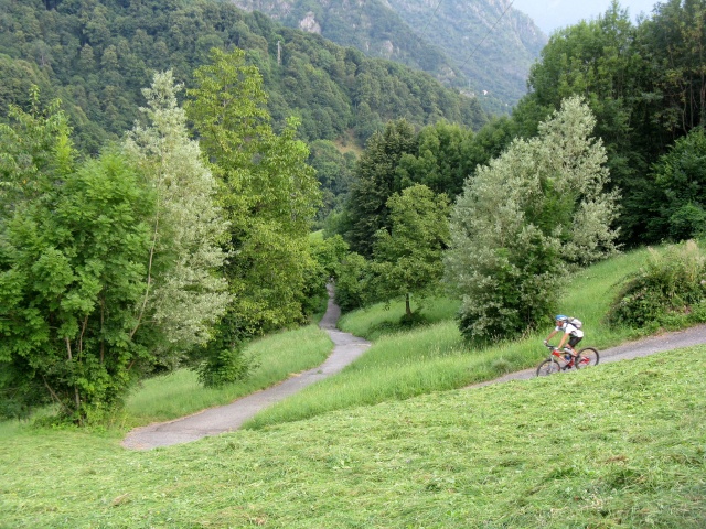 Giro caratteristico che si sviluppa all’interno della Valcavargna con partenza da piccolo abitato situato sopra Porlezza. Si percorre tratto in asfalto passando da Cusino, San Bartolomeo e San Nazzaro (strada in salita intervallata da breve tratto discensivo) con pendenze regolari ed abbastanza contenute. Superato l’abitato di San Nazzaro, seguendo le indicazioni per il Rifugio Croce di Campo, la traccia devia sulla destra su una stretta strada asfaltata dalle pendenze particolarmente accentuate trasformandosi successivamente in fondo sterrato (pendenze ancor più importanti fino al 20,5%) fino a raggiungere il bivio che conduce al sopracitato Rifugio. Si consiglia di proseguire dritto su strada sterrata in modesta ascesa fino all’alpeggio posto ai piedi dell’imponente piramide del Pizzo di Gino (Alpe di Piazza Vacchera), ove termina il percorso ciclabile per MTB. Vale la pena proseguire a piedi su sentiero escursionistico per giungere in vetta al Pizzo di Gino ove si può godere di maestoso panorama su alto Lago Como, rilievi circostanti, foce dell’Adda, prealpi svizzere e visione d’insieme della Valcavargna. Dal Pizzo di Gino si scende per la strada dell’andata, riprendendo il mezzo all’Alpeggio e proseguendo in leggera discesa fino al bivio per il rifugio Croce di Campo. A questo punto si prende la strada sterrata a sinistra in direzione del medesimo (consigliato in quanto presente terrazza panoramica sulle vette della Valcavargna) con breve risalita caratterizzata da pendenze interessanti (10-11%). Il ritorno ha luogo, per pochi tornanti, lungo la strada appena fatta deviando ad un certo punto sulla sinistra all’interno di prati per prendere immediatamente un sentiero contrassegnato da bollini bianchi. Si segue, pur con qualche asperità, il sentiero prativo sino a giungere in prossimità di una croce posta sul culmine di un dosso, ove si incontra una strada in asfalto che conduce a delle baite sottostanti in località Ambresello-Vraghez; seguendo attentamente la traccia GPS si imbocca sulla sinistra dell’abitato un nascosto sentiero nel bosco che conduce alla ripresa della strada in asfalto fuori dall’abitato di San Bartolomeo. Tale sentiero costituisce il tratto più difficoltoso causa pendenze e vegetazione che spesso richiedono interruzioni di pedalata: si consiglia di seguire attentamente la traccia gps in quanto sono presenti molteplici diramazioni ed il sentiero a tratti si disperde nella vegetazione. Si percorre un breve tratto comune con la strada dell’andata e giunti al centro di San Bartolomeo si scende verso Sora, si prosegue la discesa verso il fondo valle e dopo breve risalita su mulattiera si giunge a Carlazzo, punto di partenza dell’itinerario